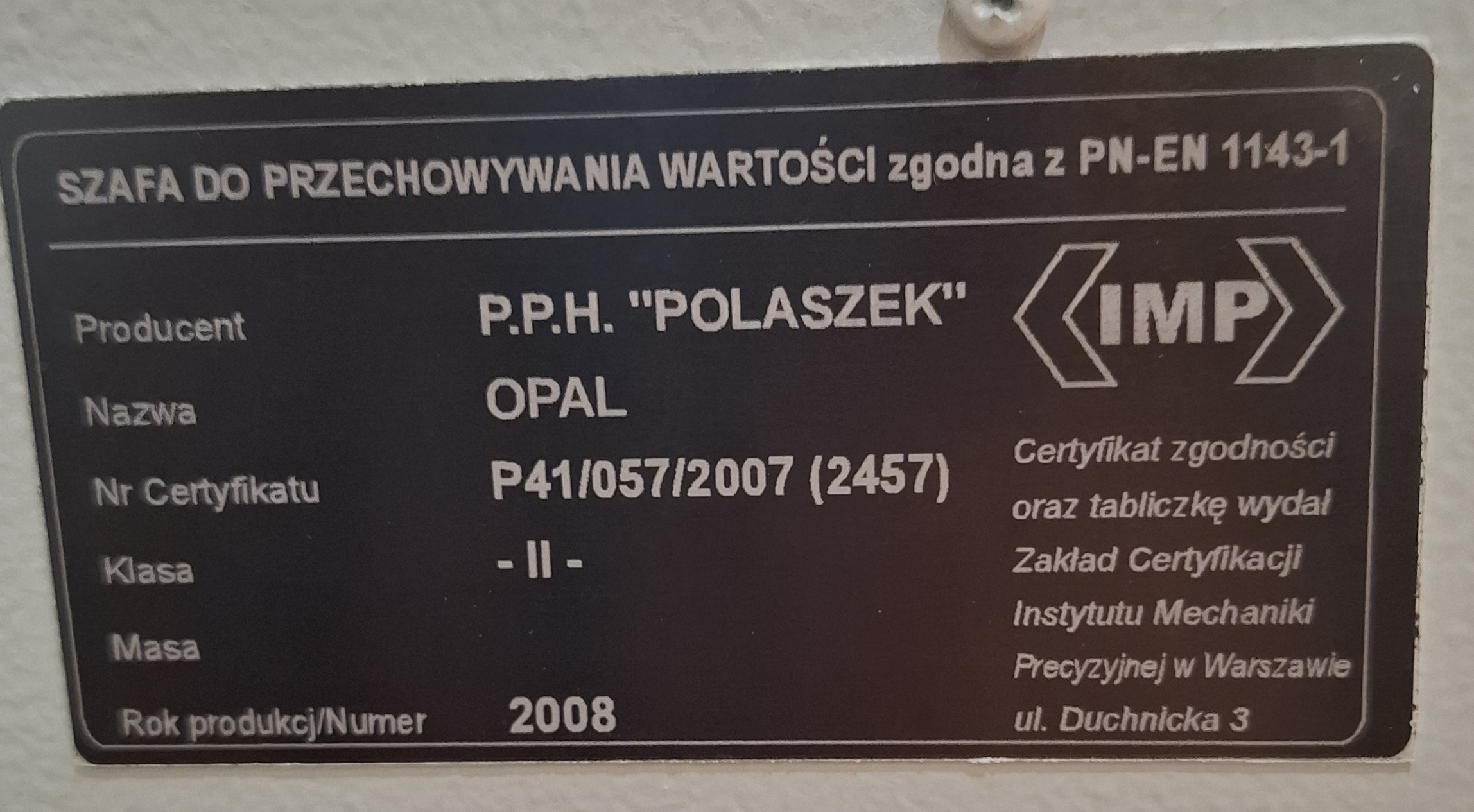 Sejf firmy Polaszek, model Opal, sejf wyprodukowany w II klasie odporności na włamanie.