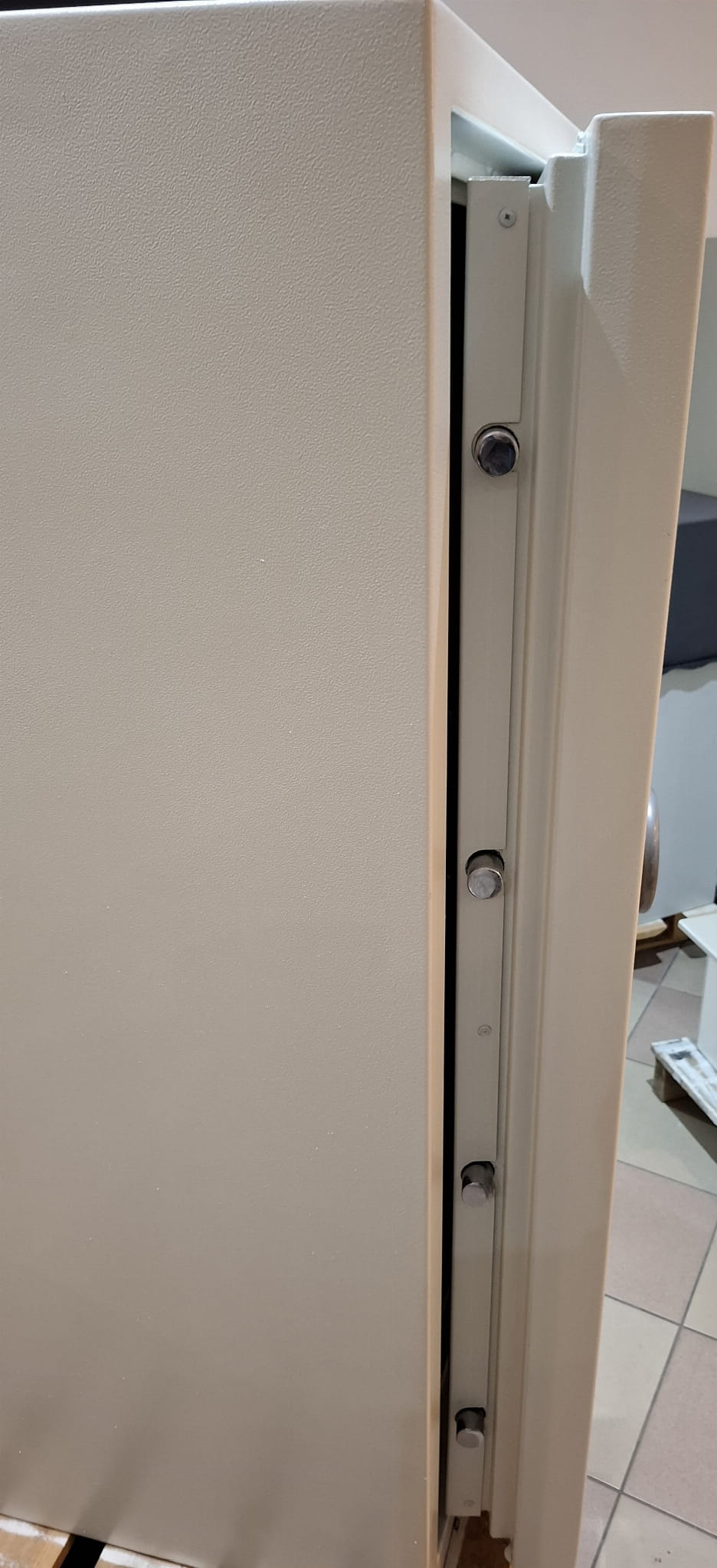 Wymiary zewnętrzne w/s/g 150/68/70 (+5 cm wystaje klamka), wymiary wewnętrzne w/s/g 133/50/45. Drzwi zamykane na dwa niezależne zamki elektroniczne Wittkopp (instrukcje wraz z sejfem), wewnątrz cztery przestawne półki, otwór umożliwiające przymocowanie do podłoża, waga 1140 kg.
