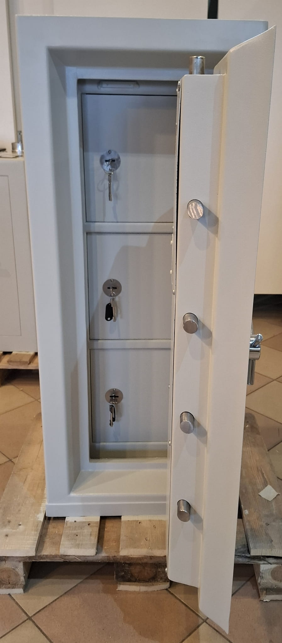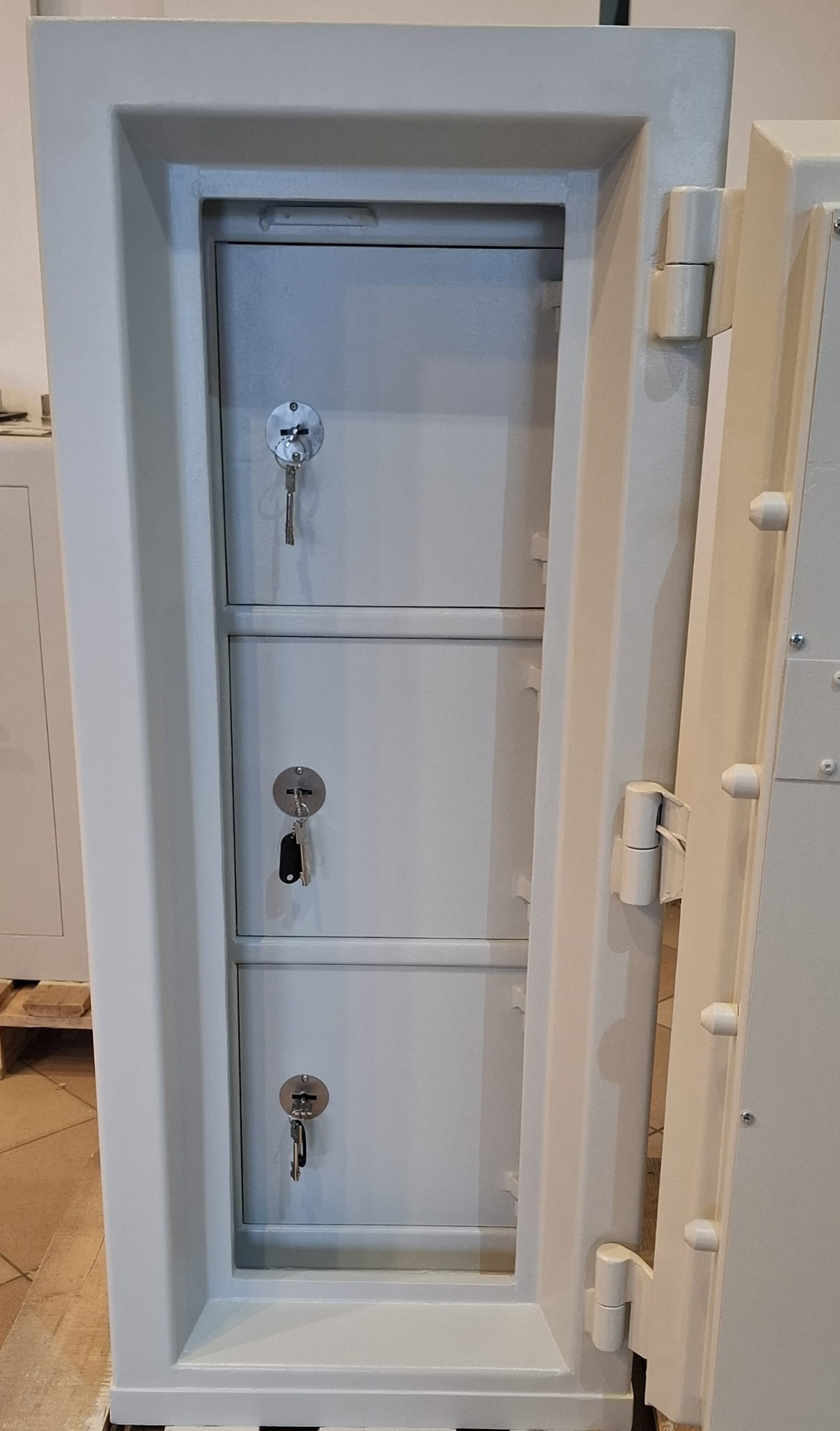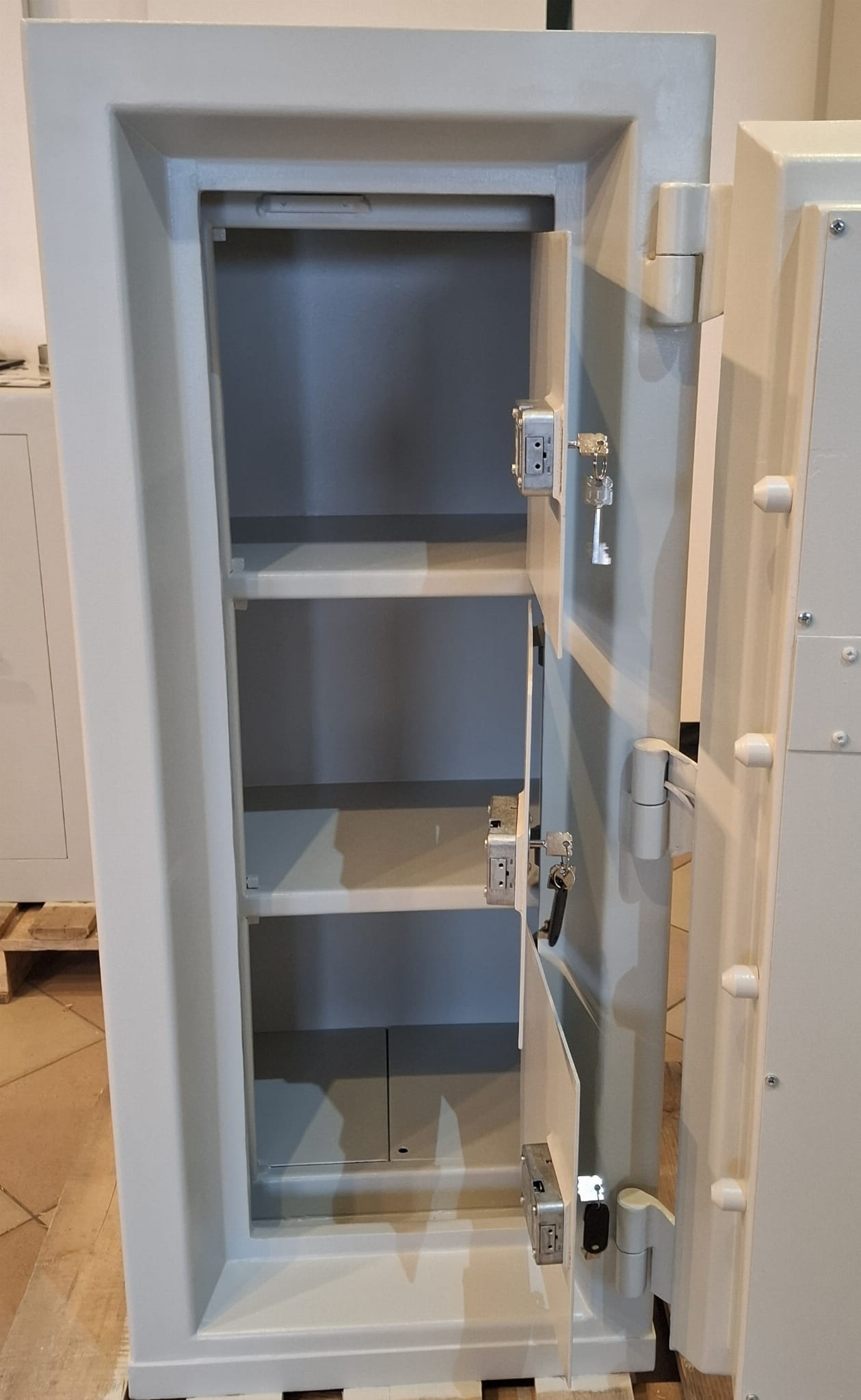 Drzwi zamykane na dwa niezależne zamki: elektroniczny Wittkopp insys (zamek zresetowany do ustawień fabrycznych) i szyfrowy mechaniczny (instrukcja i klucz do samodzielnej zmiany szyfru wraz z sejfem), wewnątrz trzy oddzielnie zamykane skarbczyki o wymiarach w/s/g 36/37/27 cm (drzwiczki od skarbczyków można zdjąć), dwa otwory umożliwiające przymocowanie sejfu do podłoża.