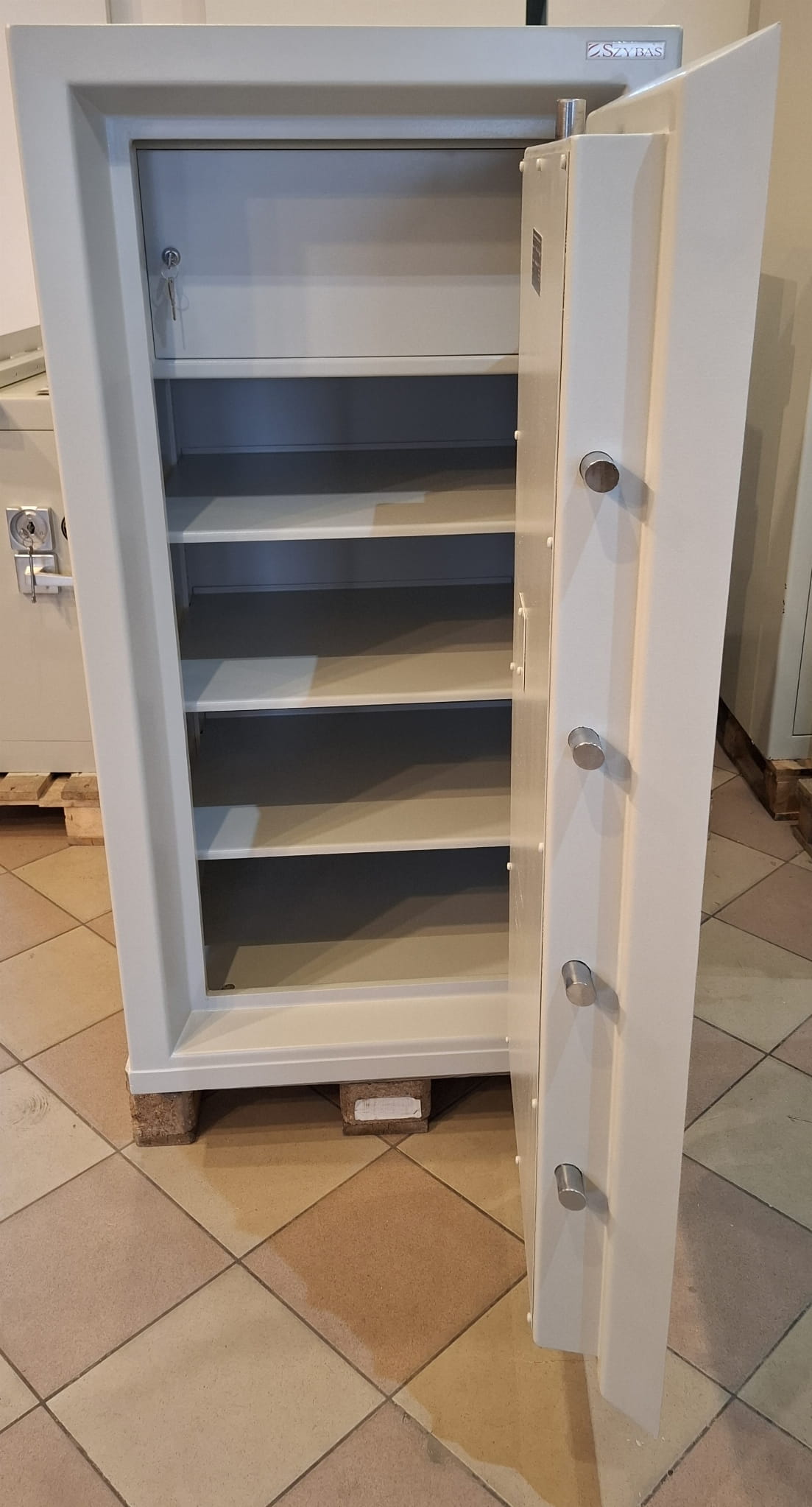 Wymiary wewnętrzne (wysokość do skarbczyka) w/s/g 95/58/52. Drzwi zamykane na dwa niezależne zamki: kluczowy (dwa klucze) i szyfrowy mechaniczny (instrukcja i klucz do samodzielnej zmiany szyfru wraz z sejfem), wewnątrz trzy regulowane półki i oddzielnie zamykany skarbczyk o wymiarach w/s/g 30/60/46 cm, dwa otwory umożliwiające przymocowanie sejfu do podłoża.
