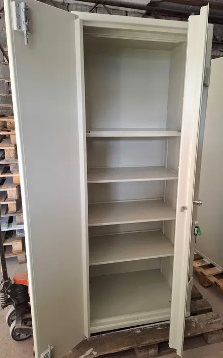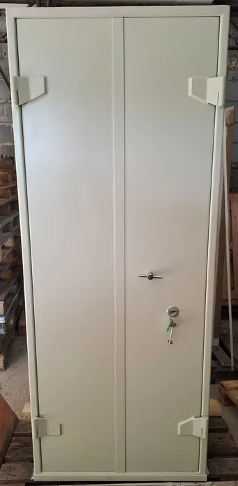 Sejf ma wymiary zewnętrzne; wysokość 198 cm, szerokość 80 cm, głębokość 60 cm (+5 cm wystaje klamka), wymiary wewnętrzne (do stałej półki) w/s/g 130/71/46 cm, waga 390 kg. Wewnątrz 3 przestawne półki i jedna stała, drzwi zamykane na zamek kluczowy kl. A (stosowany w większości sejfów kl. I i II i szaf pancernych) z dwoma kluczami. Dostępne kilka sztuk, dysponuję również wersją z dwoma zamkami.